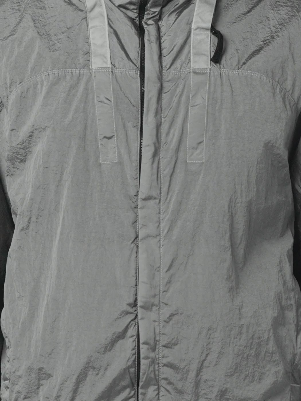 • Foldaway hood with fixed elasticated drawcord in stand collar, enclosed with zip fastening under nylon tape trim that extends down shaped front yoke